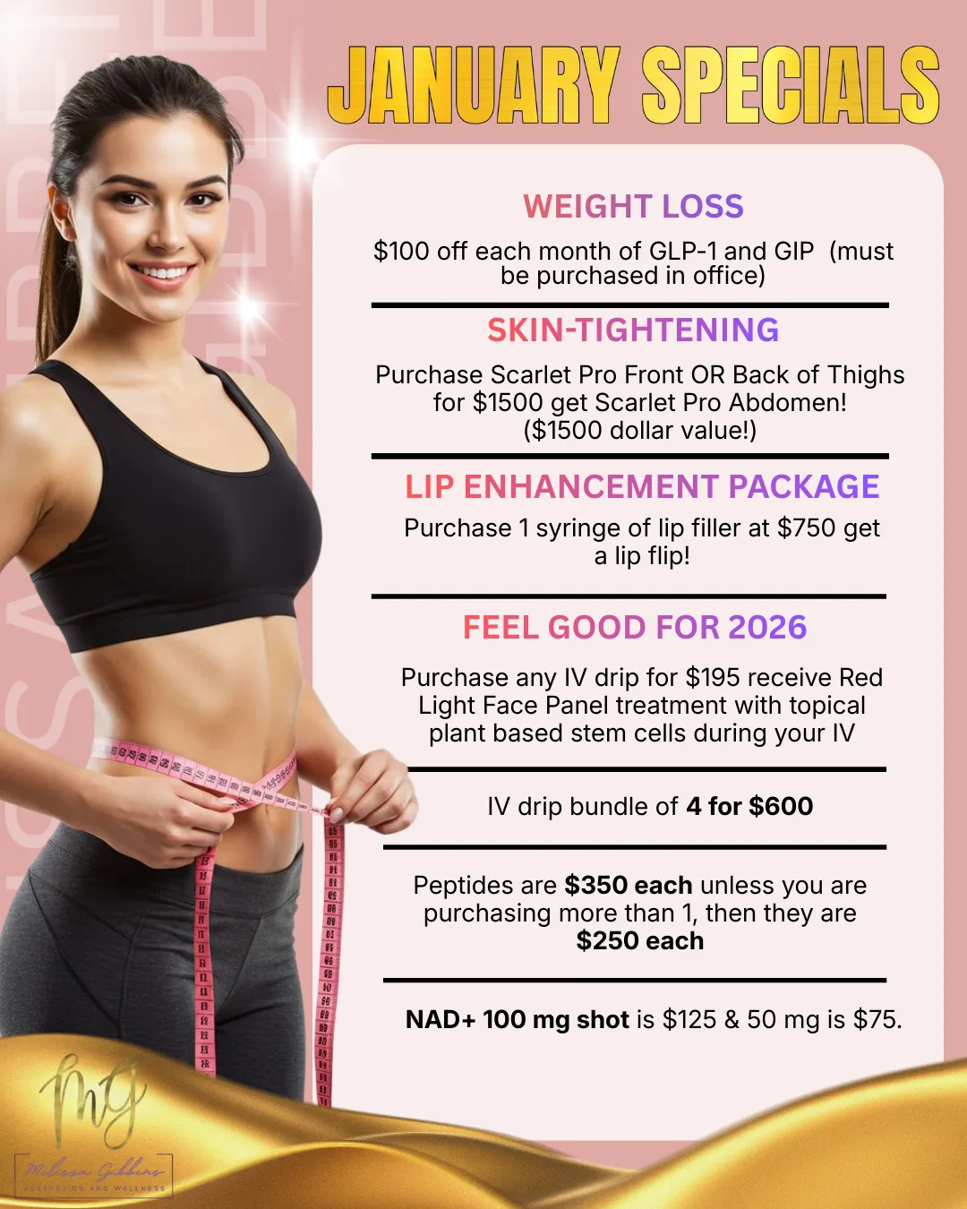 At Melissa Gibbens Aesthetics, our January Specials are designed to help you lose the weight that won’t budge, tighten what’s changed, and restore the energy you used to have without extremes, guilt, or guesswork.